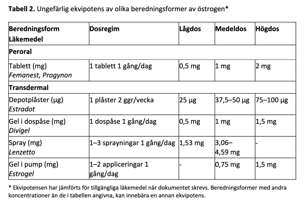 Tabellen är skapad år 2025 och visar ungefärlig ekvipotens av olika beredningsformer av östrogen för de läkemedel som fanns när tabellen skapades.